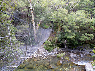 The track to the hut stays close to and somewhat above the Waingawa River and is only about 8km long and involves no big climbs, but takes a solid 4hrs to complete. For the first 20 minutes or so the route follows a gravel road and is a nice and pleasant start of the walk. Before long the track entered the bush and the going became much harder due to the constant rise and fall of the track and the relentless battling with tree roots and rocks. The weather was really hot as well and it was a relief to arrive at a sign telling me I was 8 minutes away from a swing bridge which leads on to the hut a further 5 minutes away on the other side of the river. Mind you there was a really steep drop of around 80m down to the bridge, so it seemed like a very long 8 minutes.